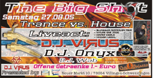 DJ.Virus (Blutonium Records), DJ.Onyx (Ravers United) und dem Newcomer DJ.Wab (Trance United) werden im Bajazzo Club in Villingen die Partygemeinde aus dem Schwarzwald und Umkreis zum kochen bringen. Für den Flüssikeitsverlust der wütenden Tanzgemeinschaft ist auch gesorgt. Alle offenen Getränke sind für 1€ zu haben. Wer kann dazu schon nein sagen |
